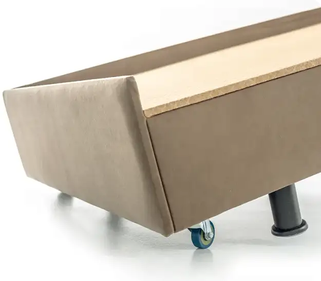 Соединение: С помощью специального зацепа – «крокодила» кровати легко соединяются в полноценную двуспальную кровать. Мобильность: Металлические ручки и колесные ролики облегчают перемещение кровати. Обивка: Каркас оклеивается поролоном толщиной 10 мм, что обеспечивает дополнительный комфорт. Основание под матрас обтягивается антискользящей тканью, предотвращая смещение матраса при эксплуатации. Кровать обивается мебельной тканью на выбор. Основание: Плита МДФ толщиной 10 мм, устойчивая к влажности и высоким нагрузкам. Каркас: Изготовлен из соснового бруска 30*40 мм, углы скруглены при помощи мебельного картона. Боковины обшиты ДВП. Просвет над полом: 100 мм. Габаритные размеры: 30х200х90 см